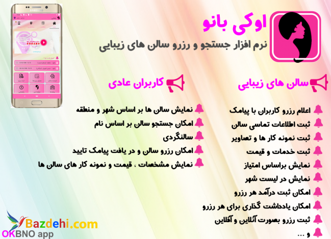 اوکی بانو : اپلیکیشن و سامانه رزرو سالن های زیبایی دانلود : https://cafebazaar.ir/app/ir.okbano.okbano/ ? یک دستیار عالی برای سالن های زیبایی و یک راهنمای مناسب برای مشتریان ? پشتیبانی از 1088 منطقه ایران با سرور های قدرتمند ? اطلاع رسانی رزرو ها با پیامک و نوتیفیکیشن در تلفن همراه شما ? دانلود و نصب رایگان بعضی از امکانات : 1️⃣مثل یک دفتر ثبت رزرو آفلاین ، می توانید رزرو های روزانه خود را در تلفن همراه ثبت نمایید. 2️⃣ثبت تصاویر نمونه کارها و لیست خدمات همراه با محدوده قیمت 3️⃣ثبت اطلاعات سالن شما برای نمایش به کاربران 4️⃣نمایش لیست سالن های هر شهر و هر منطقه 5️⃣امکان رزرو آنلاین برای کاربران و تایید شما 6️⃣ امکان سالنگردی و دسترسی مطالب آموزشی و ویدئو تبلیغاتی 7️⃣امکان عضو گیری و دادن کد معرف به کاربران و کلی امکانات دیگه که باید حتما نصب کنید تا متوجه بشین ?? ? توجه ، توجه ? شما در منطقه خود می توانید با دریافت کد همکار در جذب سالن های زیبایی با ما همکاری و پورسانت 20 تا 40 درصدی دریافت نمایید اطلاعات بیشتر در وبسایت اوکی بانو http://okbano.ir پشتیبانی در تلگرام:@okbano