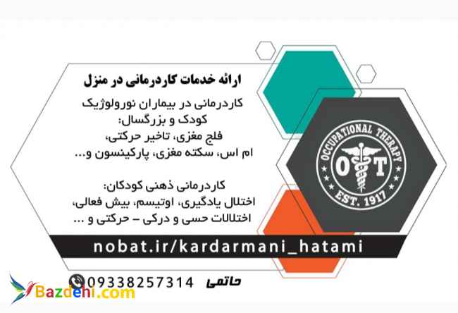 کاردرمانی در منزل بیماران نورولوژیک کودک و بزرگسال(فلح مغزی، تاخیر حرکتی، شارکوماری توث، میوپاتی عضلانی، سکته مغزی، ام اس، پارکینسون) کاردرمانی ذهنی کودکان(اوتیسم، بیش فعالی و نقص توجه،اختلالات یادگیری) کاردرمانی در منزل سکته مغزی کاردرمانی در منزل سالمندان کاردرمانی در منزل ام اس و پارکینسون