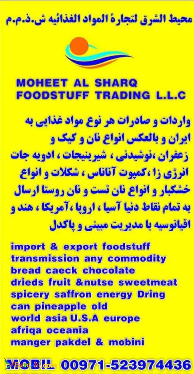 شرکت بازرگانی واردات و صادرات محیط الشرق در امارات دبی با مدیریت علی پاکدل در کل امارات در خصوص واردات و صادرات هر نوع کالا بخصوص در بخش مواد غذایی و ترانسفر کالا از کشور مبدا تا کشور مقصد بصورت تضمینی و صادرات کالا از کشورهای حاشیه خلیج فارس کالای تولیدی مصرفی برای صادرات به امارات اروپا هند و آفریقا در بخش مواد غذایی با ثبت شرکت foodstuff _ moheet Al Sharq و با شماره ۰۰۹۷۱۵۲۳۹۷۴۴۳۶ برای انجام هر گونه کالاهای وارداتی و صادراتی در خدمت مشتریان گرامی هستیم . آدرس جمیل این آدرس ایمیل توسط spambots حفاظت می شود. برای دیدن شما نیاز به جاوا اسکریپت دارید .....لطفا برای ارتباط با بنده با شماره امارات واتس آپ و تلگرام ۲۴ ساعته حاضر به پاسخگویی میباشم . ...