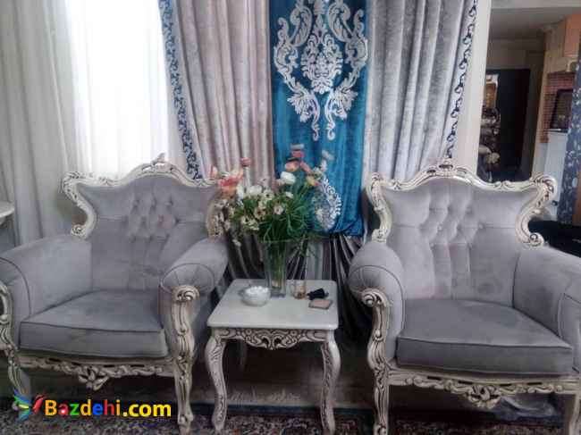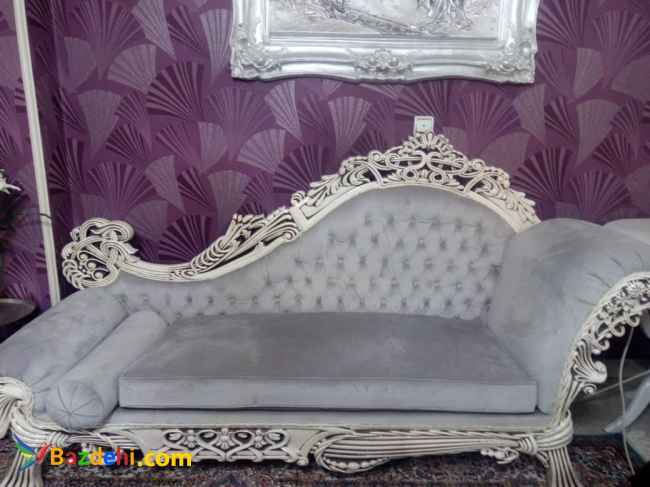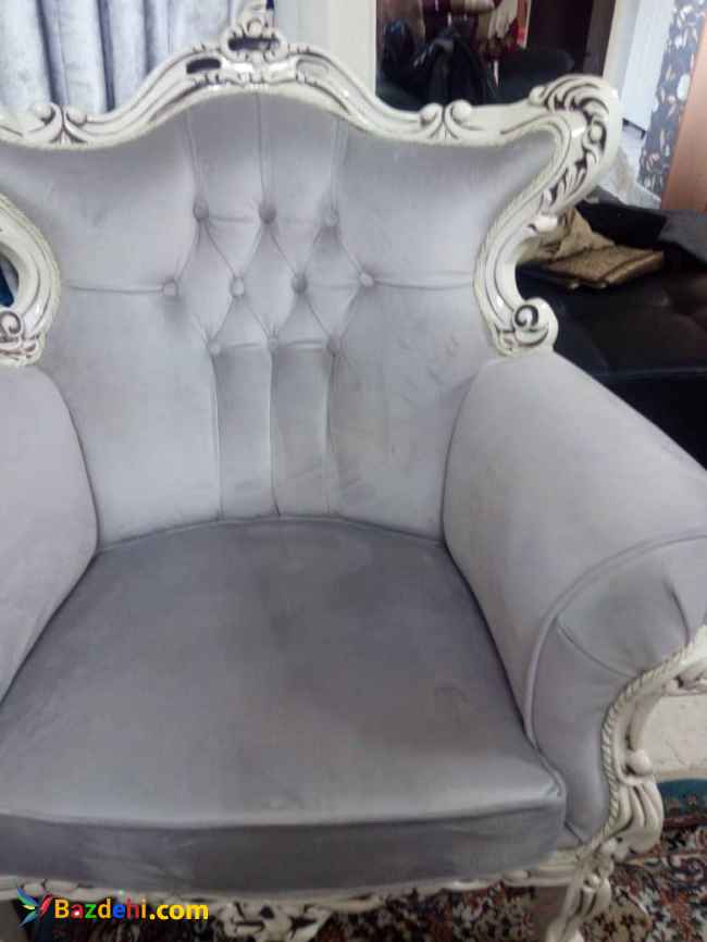 يک دست مبل هفت نفره شزلون به رنگ فيلي چوب منبت کاری شده