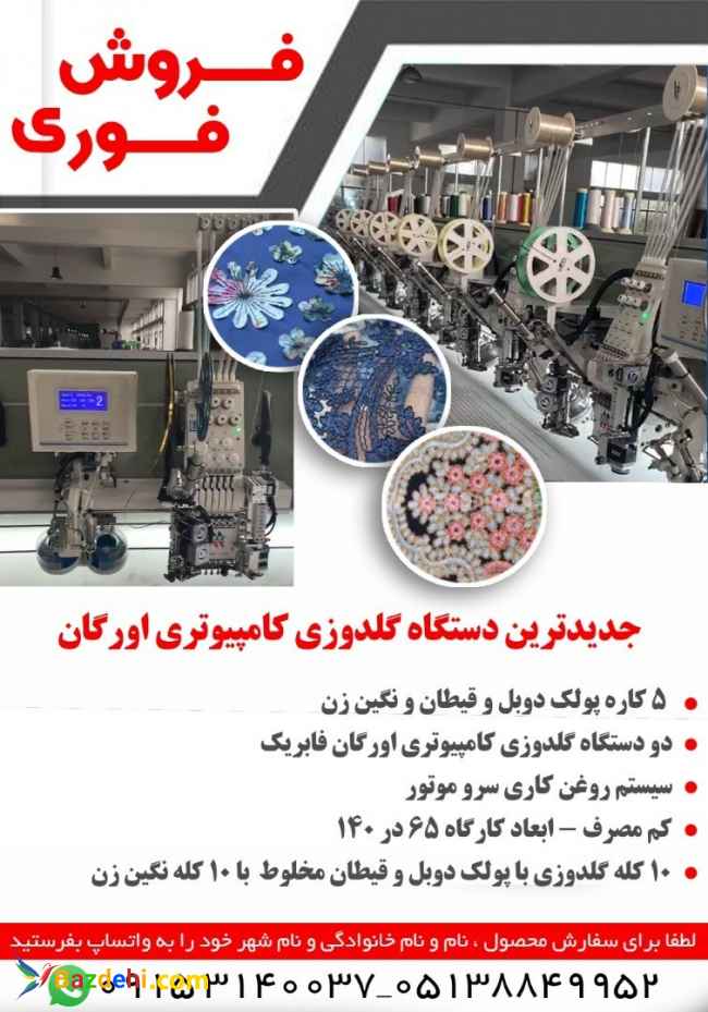 10 کله گلدوزی با پولک دوبل و قیطان مخلوط با 10 کله نگین زن دو دستگاه گلدوزی کامپیوتری اورگان فابریک ورژن جدید ، کله گی جدید، کم مصرف سیستم روغن کاری سرو موتور ابعاد کارگاه 65 در 140 فروش فوری تحویل یک ماهه ............................................................................ به کانال تلگرام مابپیوندید : http://t.me/goldoziorgan  به کانال اینستا مابپیوندید: https://instagram.com/_u/goldozi.com.embroidery  سایت گلدوزان ایران: www. goldozi.com تلفن تماس جهت هماهنگی: 09153140037   05138849952 05138849953 با مدیریت: مجید ذوالفقاری