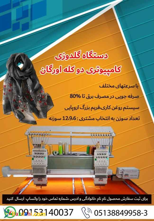 صرفه جویی در مصرف برق تا %80 سیستم روغن کاری،فریم بزرگ اروپایی تعداد سوزن به انتخاب مشتری : 12،9،6 سوزنه با سرعتهای مختلف ............................................................................ به کانال تلگرام مابپیوندید : http://t.me/goldoziorgan به کانال اینستا مابپیوندید: https://instagram.com/_u/goldozi.com.embroidery سایت گلدوزان ایران: www. goldozi.com تلفن تماس جهت هماهنگی: 09153140037 05138849952 05138849953 با مدیریت: مجید ذوالفقاری