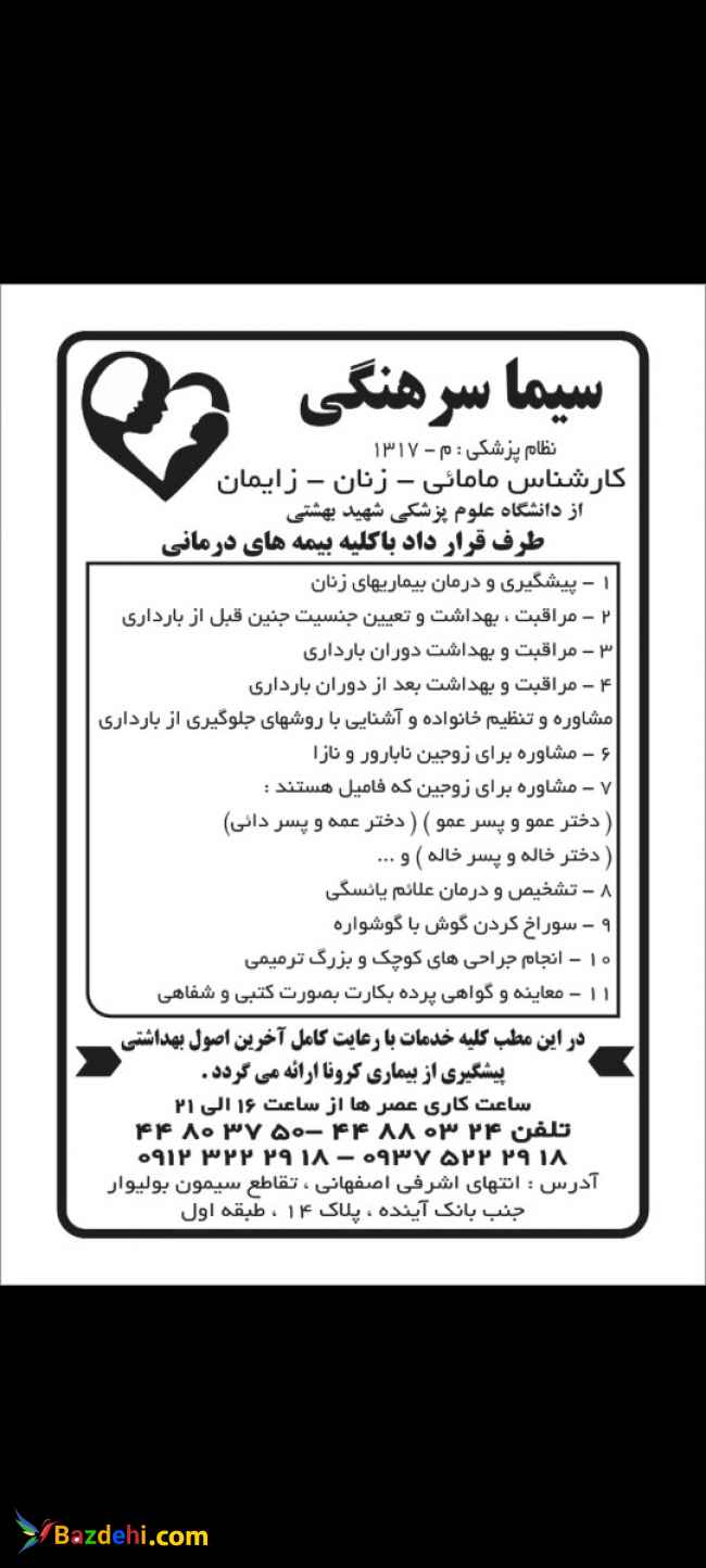 ارایه کلیه خدمات مربوط به بیماری های زنان مشاوره پیش از بارداری ویزیت بارداری و بیماریهای زنان مشاوره زناشویی خدمات پیشگیری از بارداری ،آیودی و... گواهی پرده بکارت ....
