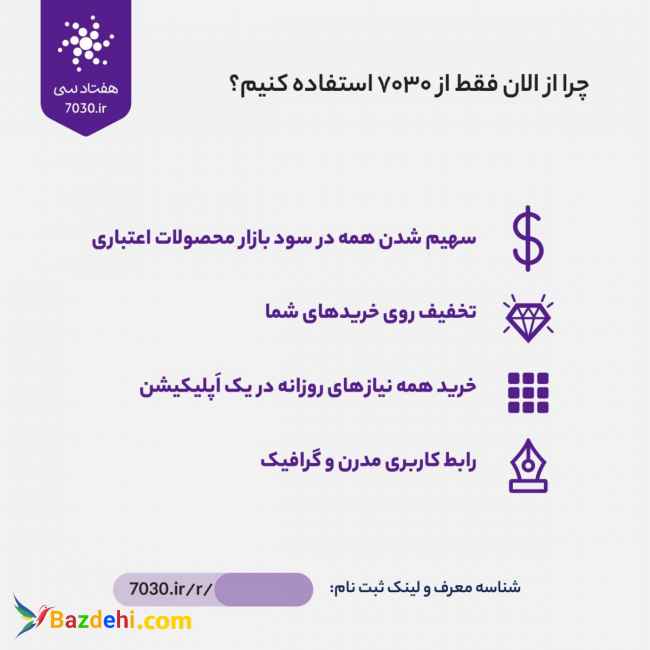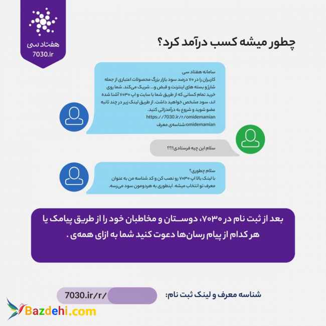 شما روی خرید کسانی که از طریق شما با سایت و اپ ۷۰۳۰ آشنا شده اند، سود مشخص خواهید داشت.