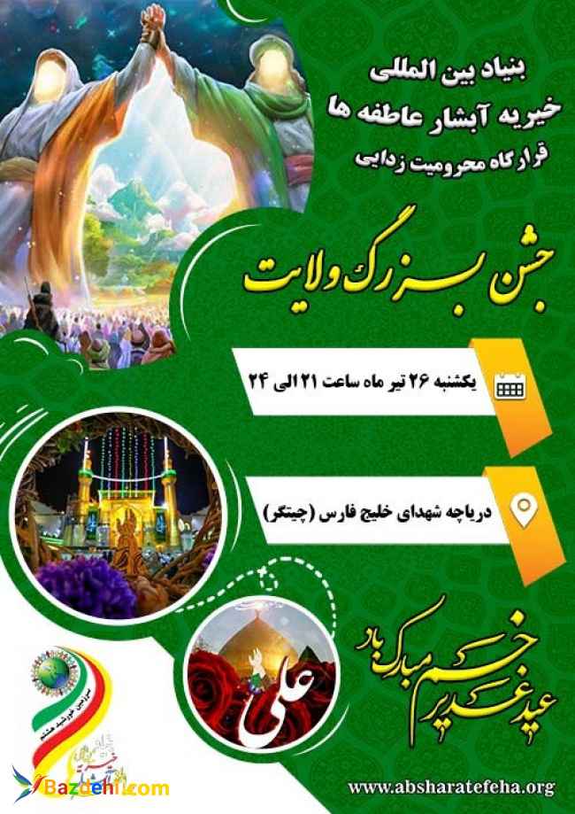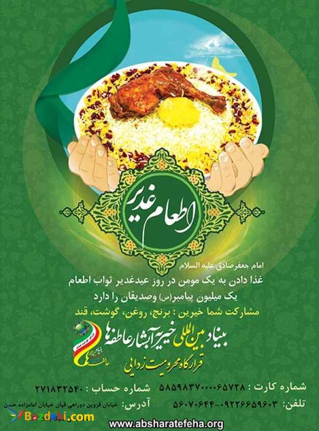 امام صادق (ع) : غذا دادن به یک مومن در روز عید غدیر ثواب اطعام یک میلیون پیامبر و صدیق و یک میلیون شهید و یک میلیون فرد صالح در حرم خداوند را دارد. غدیر، یک اتفاق ساده نیست؛ یک گزینش رحمانی است. غدیر، یک کلمه نیست، یک برکه نیست؛ یک دریاست؛ رمزی است بین خدا و انسان. غدیر، گل همیشه بهار زندگی است. دریایی بی‌کرانه است؛ جاری بر جان‌هـای پاک و اندیشه‌هـای تابناک. غدیر، ادامه بعثت است براى شكستن بت هاى فكر و دل، براى عبور از خودپرستى به خداپرستى است . عید غدیر مبارک قرارگاه محرومیت زدایی بنیاد بین المللی خیریه ابشارعاطفه ها قصد دارد تا در روز عید غدیر به مناسبت به امامت رسیدن مولای متقیان و امیر بیان اقدام به برپایی "جشن بزرگ ولایت "در 26 تیر ماه 1401 ساعت 21 الی 24 در دریاچه شهدای خلیج فارس نماید شماره کارت: 5859837000065728 شماره حساب: 271832540 شبا:680180000000000271832540