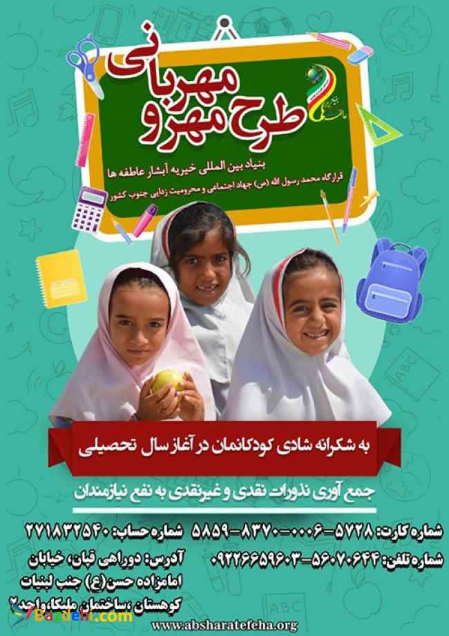 باز مهر آمد؛ ماه مهربانی وعشق، ماهی که کودکان دوباره قلم به دست می گیرند تا الفبای زیبای فارسی را با مایه مهرورزی آموزگارشان در هم آمیخته و جملات زیبای دلشان را روی برگهای سفید دفترشان بنویسند. دفترهایی که به رنگ دلهای پاکشان است… بنیاد بین المللی خیریه آبشار عاطفه ها قرارگاه محمد رسول الله (ص) جهاد اجتماعی و محرومیت زدایی جنوب کشور به مناسبت آغاز سال تحصیلی ، اقدام به اهدای لوازم التحریر به کلّیه دانش آموزان تحت پوشش خود می نماید تا این عزیزان بدور از هرگونه دغدغه، سر کلاس مدرسه بروند. شما عزیزان نیز میتوانید از راه های زیر کمک های نقدی و غیر نقدی خود را به دستشان برسانید. شماره کارت: 5859837000065728 شماره حساب: 271832540 شبا:680180000000000271832540 آدرس: خیابان قزوین دوراهی قپان خیابان امامزاده حسن ساختمان ملیکا پلاک 62
