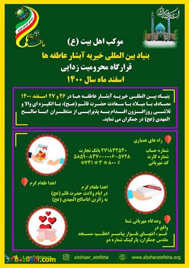 در تقويم انتظار، همه فصل ها از عطر بهاري مهدي (عج) متبرک است. نوروز منتظران روزي است که از شب نيمه شعبان آغاز مي شود. انتظار، فاصله اي است ميان دو جمعه: جمعه ولادت و جمعه ظهور. بهار، همه طراوتش را مديون يک گل است: گل زيباي نرگس. اگر سختي زمستان غيبت نبود، شوق آمدن بهار عدالت معنا نداشت. خانه تکاني، رسم قديمي همه منتظران بهار است. بهارِ مهدي (عج) از راه مي رسد، خانه تکاني دل ها را فراموش نکنيم. بهترين هديه اي که مي توان براي گلدان شکسته قلب منتظران خريد، يک شاخه گل نرگس است. جمعه ها کافي نيست، هر روز سهمي را به امام زمان(عج) اختصاص بدهيم. منتظران واقعي به اشک و آه و دعا اکتفا نمي کنند. بنیاد بین المللی خیریه ابشارعاطفه ها در 26 و 27 اسفند 1400 مصادف با میلاد با سعادت حضرت قائم (عج) با انگیزه ای والا و تلاشی روز افزون اقدام به برپایی موکب اهل بیت (ع) و پذیرایی از منتظران اباصالح المهدی (عج) در جمکرا می نماید. شماره حساب:271832540 شماره کارت:5859837000065728 شبا:680180000000000271832540