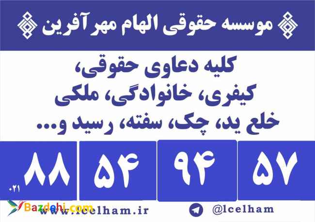 موسسه حقوقی الهام با وکلای متخصص و مجرب بهترین مشاور و وکیل شما جهت انجام کلیه دعاوی حقوقی، کیفری، خانواده، ملکی، عقد قرار داداهای و داخلی، ثبت و امور اداری و دولتی: - دادگاه بدوی – تجدید نظر و ... - دیوان عدالت اداری - تامین اجتماعی - کارگر و کارفرما - بازنشتگی - شهرداری ها - بیمه و مالیات - و ... -تهران - خیابان شهید بهشتی - نرسیده به خیابان قائم مقام - ساختمان 402- واحد 26 شماره تماس: 88549457- موسسه حقوقی الهام مهرآفرین با مدیریت منصور خوشنویسان