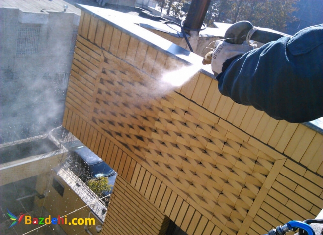 3- شستشوی نما با واترسندبلاست : این نوع شستشوی نما که با دستگاه های واترجت فشار قوی انجام میشود که همزمان آب و سیلیس را با فشار بالا به سطح مورد نظر میپاشد