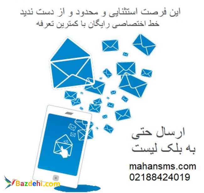 خط اختصاصی رایگان با کمترین تعرفه - ارسال حتی به بلک لیست شرکت ماهان گستر طاها ارائه دهنده کاملترین بانک مشاغل ایران با مجوز رسمی نماد اعتماد با 13 سال سابقه درخشان به همراه 85میلیون عدد شماره موبایل مشاغل تهران و شهرستانها فروش بانک شماره موبایل مشاغل، دایرکتوری های جامع شامل آدرس تلفن، شغل و... وفروش خط اختصاصی و ارسال sms تبلیغاتی به هرشماره ای (همراه اول – ایرانسل) برای دریافت خط اختصاصی رایگان ویا ارسال پیامک تبلیغاتی با مشاورین ما در ارتباط باشید. 09212181037 02188424019 Mahansms.com
