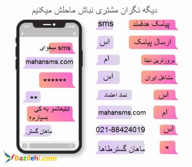 شرکت ماهان گسترطاها مفتخراست از سال 1389 مجری بزرگترین و به روز ترین بانک های اطلاعاتی و شماره موبایل ایران با مجوز رسمی نماد اعتماد دارای به روز ترین و متنوع ترین مرجع تخصصی بانک شماره موبایل، دایرکتوری، کدپستی و بیش از 1000 گروه شغلی میباشد. شرکت ما موثرترین راه تبلیغات، تبلیغات هدفمند ارسال پیامک انبوه براساس سن، جنسیت، شغل، پیش کد شماره مویابل و... را برای شما فراهم کرده است. ارسال پیامک حتی به ** بلک لیست ** باما میتوانید کسب وکار خود را ارتقا دهید و در میان رقبا متمایز شوید جهت تماس با مشاورین و کارشناسان ما با شماره های زیر تماس حاصل فرمایید: 021-88424019 09212181037 یابرای خرید بانک شماره موبایل و مشاهده نماد اعتماد ما وارد سایت زیر شوید : Mahansms.com