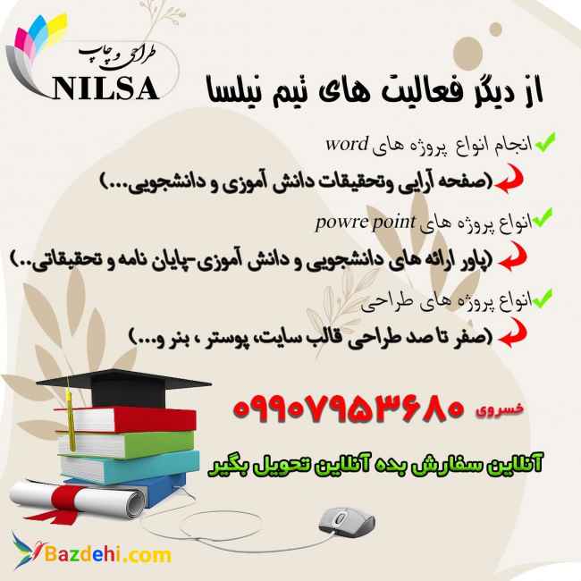 چاپ و تبلیغات نیلسا همیشه و همه جا در دسترس شما,تحویل سفارشات شما درب محل کار شما. ◆برای دیدن نمونه های بیشتر به آدرس اینستگرامی یا تلگرامی درج شده در آگهی مراجعه فرمایید. طراحی انواع کارت ویزیت -تراکت -بنر -پوستر -فاکتور -سربرگ -پست و استوری اینستاگرام و..... پذیرفته میشود. *طراحی به صورت تحویل فایل طراحی شده با هزینه مناسب انجام می شود.* هر ماه از تخفیفات ویژه نیلسا بهره مند شوید. با نیلسا بدرخشید✔ 09907953680 خسروی