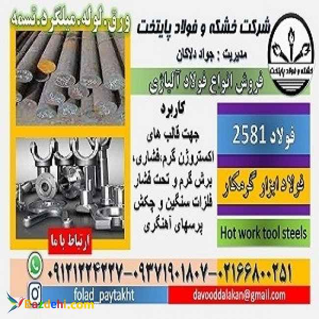 شرکت خشکه و فولاد پایتخت(( مدیریت : جواد دلاکان )) صنعتگران عزیز، افتخار داریم. که سی سال تجربه گرانبهای خویش را در زمینه عرضه انواع ورق آلیاژی. و انواع فولاد آلیاژی برای خدمت رسانی به شما هموطنان کشور عزیزمان ایران ارائه می دهیم. پیشاپیش از اینکه شرکت خشکه و فولاد پایتخت را جهت خرید خود انتخاب می نمایید سپاسگزاریم. ارتباط با ما: ۰۹۱۲۱۲۲۴۲۲۷ ۰۹۳۷۱۹۰۱۸۰۷ تلفن: ۰۲۱۶۶۸۰۰۲۵۱ فکس: ۶۶۸۰۰۵۴۶ فولاد ابزار گرمکار 2581 از دسته فولادهای آلیاژی گرمکار بوده که با نام X30WCrV9-3 نیز در میان فولادها معروف است. این نوع فولاد شامل ترکیب شیمیایی متوسط 0.3 % کربن، 0.4% سیلیسیوم، 0.4% منگنز، 2.5% کروم، 0.7% وانادیوم و 4.5% تنگستن می باشد. فولاد 2581 به دلیل درصد بالای تنگستن دارای مقاومت به حرارت و سایش بسیار خوب و چقرمگی پایین می باشد. از موارد مورد کاربرد این فولاد آلیاژی در صنعت می توان به قالب های ریخته گری تحت فشار ماهیچه های قالب ها. برای کار با فلزات غیر آهنی و اجزای قالب های پرس کاری، پرس های اکستروژن گرم، و قالب های برش گرم. قابل کابرد در اکستروژن فلزات، ریخته گری تحت فشار,جهت قالب های اکستروژن گرم،فشاری، برش گرم و تحت فشار فلزات سنگین و چکش پرسهای آهنگری نام برد. خصوصیت: استحکام کششی بسیار بالا (در حالت نرم)، بازگشت پذیری خوب. مقاومت به سایش خیلی خوب، مقاوم در برابر شوک حرارتی