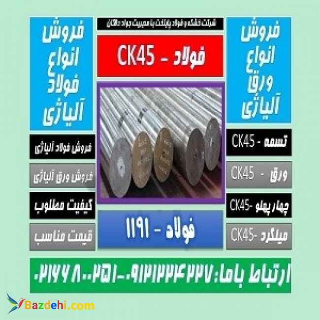 فولادck45-میلگردck45-فولاد ماشینکار فولادck45- ورقck45- میلگردck45 – 1191 – فولاد۱۱۹۱ -فولاد استحکام بالا شرکت خشکه و فولاد پایتخت (( مدیریت : جواد دلاکان )) صنعتگران عزیز، افتخار داریم که سالها تجربه گرانبهای خویش را در زمینه عرضه انواع ورق آلیاژی و انواع فولاد آلیاژی برای خدمت رسانی به شما هموطنان کشور عزیزمان ایران ارائه می دهیم. پیشاپیش از اینکه شرکت خشکه و فولاد پایتخت را جهت خرید خود انتخاب می نمایید سپاسگزاریم. ارتباط با ما: ۰۹۱۲۱۲۲۴۲۲۷ ۰۹۳۷۱۹۰۱۸۰۷ تلفن: ۰۲۱۶۶۸۰۰۲۵۱ فکس: ۶۶۸۰۰۵۴۶ ck45 ۱- استفاده در شرایط دمای بسیار بالا.۲- استفاده در شرایط دمای بسیار پایین.۳- استفاده از این فلز در ابزار و وسایلی که نیاز به استحکام بالا دارند. ۴- جهت ساخت مخازن تحت فشار.۵- مقاوم در برابر نمکهای دریایی و استفاده در صنایع دریایی.۶- فلز مقاوم در برابر زنگ زدگی.۷- مقاوم در برابر خورندگی هوا.۸- صنایع هواپیما سازی۹- راه سازی,پل سازی و شهرسازی.۱۰ – صنایع قطعه سازی.۱۱- صنایع ساخت ابزار.۱۲- فولادهای مقاوم در برابر اسید.۱۳- سختی بسیار بالا.۱۴- استفاده از این نوع فولاد در مصارف خاص