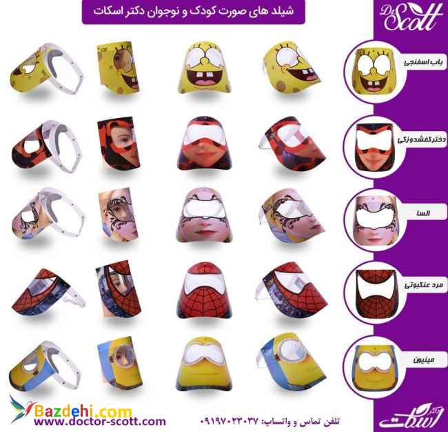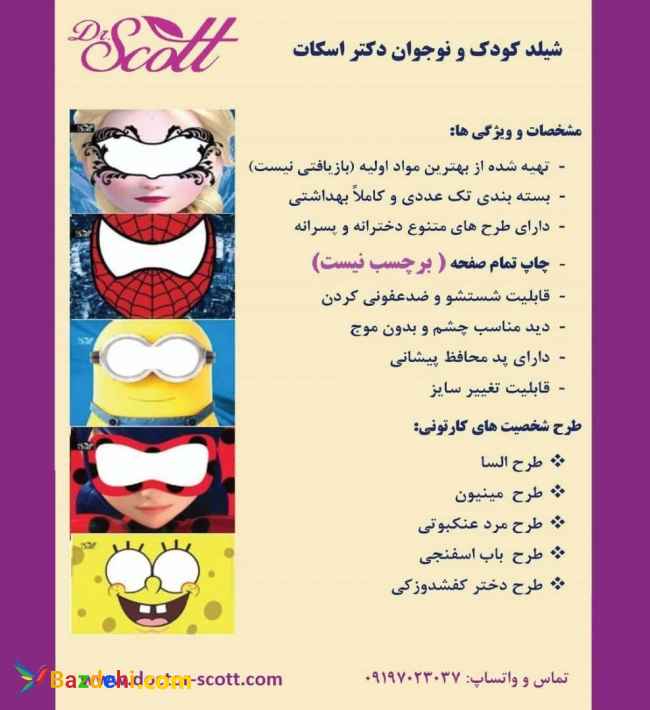 شیلد کودک و نوجوان دکتر اسکات مشخصات و ویژگی ها: تهیه شده از بهترین مواد (بازیافتی نیست) بسته بندی تک عددی و کاملا بهداشتی دارای طرح های متنوع دخترانه و پسرانه چاپ تمام صفحه( برچسب نیست) قابلیت شستشو و ضد عفونی کردن دید مناسب چشم و بدون موج دارای پد محافظ پیشانی قابلیت تغییر سایز طرح شخصیت های کارتونی : طرح السا ، مینیون ، مرد عنکبوتی، باب اسفنجی ، دختر کفشدوزکی