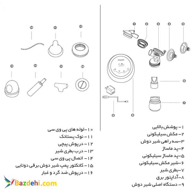 نام دستگاه : شیردوش برقی برند: داپسر Doopser مدل:DPS-8006D قدرت مکش: 280mmHg تعداد بطری: 2 بطری شیر با مخزن 150ML قابلیت کنترل و جلوگیری از برگشت و نشت شیر حالتهای مکش: حالت ماساژ و ساکشن قابلیت تنظیم سرعت : 9 سطح قابل تنظیم صفحه نمایش : نمایشگر LED با دکمه های لمسی عملکرد : با باتری قابل شارژ USB یا آداپتور مشخصات باطری: باطری قابل شارژ با ظرفیت 1100mAH مدت زمان شارژ:2.5ساعت مدت زمان شارژ دهی: امکان استفاده برای 6دفعه زمان استفاده در هر استفاده :15-20دقیقه تایمر هوشمند :خاموشی خودکار پس از 30دقیقه صدای دستگاه: کمتر از 60dB طراحی جدید با عملکرد حافظه سبک ، قابل حمل ،استفاده آسان