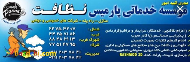 موسسه خدماتی نظافتی پارمیس شماره ثبت 45340 با بیش از 10 سال سابقه کار در سطح تهران نظافت؛ منزل،راه پله،شرکت،مغازه اسباب کشی با نیروی کار بلد و ماشین مسقف و تمیز نقاشی ساختمان با بهترین کیفیت و نیروی کارکرده ارایه فاکتور و قرار داد