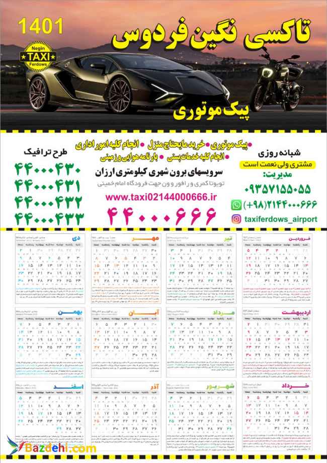 تاکسی سرویس فردوس با مجوز رسمی و ربع قرن سابقه در مدیریت و اجرای تاکسی سرویس وپیک موتوری شبانه روزی خدمات کاملی را برای مشتریان ارایه می دهد. دارای چندین شعبه در تهران می باشد. (قرعه کشی هفتگی بین کلیه مشترکین) خدمات قابل ارایه: - بیشترین آرم طرح ترافیک - بهترین کادر مجرب - تاکسی دراختیار-آماده عقد قرارداد جهت سرویس مدارس ارگانها و نهادها - خدمات شبانه روزی -تاکسی فرودگاه امام خمینی ارزان شامل تویوتا کمری ،تویوتا رافور،ون،هایس،مینی بوس،اجاره اتوبوس - خدمات سریع السیر پیک -سرویس های درون شهری وبرون شهری و کیلومتری 700 تومان شماره تماس 46013758-46013762-44431400-44487602-44487662-44487692-44487617-44487598-44487765-44436609-44441302-44026843-44026895-44026897-44044919-44015966-44000430-44000431-44000432-44000433-44000666 رزرو تویوتا رافور شهرستان-رزرو تویوتا رافور فرودگاه امام خمینی – تویوتا رافورشهرستان-تویوتارافور فرودگاه امام خمینی-رزرو تاکسی فرودگاه امام خمینی - تاکسی فرودکاه امام خمینی -تویوتا کمری فرودگاه امام- تویوتا رافورفرودگاه امام -ون فرودگاه امام خمینی- رزرو ون فرودگاه امام خمینی -ون h350-ون توریستی h350-تاکسی شهرستان- رزرو تاکسی شهرستان- تاکسی کیلومتری شهرستان -اجاره اتوبوس -تاکسی فرودگاه امام خمینی نزدیک-تاکسی همسفر-تاکسی سیروسفر-تاکسی رویال-هیترو تاکسی-تاکسی سیروسفرفرودگاه امام خمینی-تاکسی سیروسفرشهرستان-تاکسی همسفرشهرستان-رزرو ون شهرستان-رزرو ون بین شهری-رزرو ون دربستی شهرستان-رزرو ون توریستی رزرو ون دربستی شهرستان رزرو ون دربستی شمالی رزرو ون دربستی vip به کلیه شهرستان ها ون دربستی اچ 350 ون وی آی پی تویوتا کمری فرودگاه امام خمینی،تویوتا رافور فرودگاه امام خمینی،ون ،تاکسی سرویس نزدیک آیریک سنتر،تاکسی سرویس نزدیک مجتمع کوروش،تاکسی سرویس محدوده بلوار فردوس شرق و غرب ، آژانس تاکسی تلفنی شبانه روزی تلفن - سایت تاکسی فردوس-سایت تاکسی تلفنی فردوس-سایت پیک موتوری فردوس-سایت تاکسی فرودگاه امام خمینی-سایت ون فرودگاه امام خمینی-سایت رزرو تاکسی بین شهری-سایت تاکسی دربستی شهرستان-سایت تاکسی شهرستان118http://www.taxi-ajancy.ir تاکسی بین شهری تهران به تمام نقاط ایران از جمله شهرهای قم، قزوین، همدان، سمنان، اصفهان، مازندران، گیلان، گرگان و …، خوردو های لوکسی خارجی تویوتا و رنو و خودروهای برتر ایرانی سمند، اس ال ایکس، پرشیا با بهترین کرایه درحال خدمت رسانی و عقد قرارداد با شرکتها و ادارات
