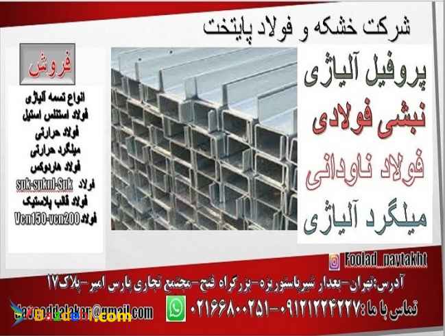 شرکت خشکه و فولاد پایتخت (( مدیریت : جواد دلاکان )) صنعتگران عزیز، افتخار داریم که سالها تجربه گرانبهای خویش را در زمینه عرضه انواع ورق آلیاژی و انواع فولاد آلیاژی برای خدمت رسانی به شما هموطنان کشور عزیزمان ایران ارائه می دهیم. پیشاپیش از اینکه شرکت خشکه و فولاد پایتخت را جهت خرید خود انتخاب می نمایید سپاسگزاریم. ارتباط با ما: ۰۹۱۲۱۲۲۴۲۲۷ ۰۹۳۷۱۹۰۱۸۰۷ تلفن: ۰۲۱۶۶۸۰۰۲۵۱ فکس: ۶۶۸۰۰۵۴۶ فولاد ناودانی یکی از مقاطع فولادی است که در دسته ی پروفیلهای باز قرارمیگیرد.و به شکل uانگلیسی میباشد و به سه روش فابریک نوردسرد-فابریک نورد گرم و پرسی تولید میشود . این پروفیل از یک سطح افقی(جان) ودوسطح عمودی(بال) تشکیل شده است. ناودانی در جنس های مختلفی دسته بندی میشود.از مهم ترین جنس های ناودانی میتوان گالوانیزه-آلومینیوم-واستنلس استیل نام برد.که آلومینیوم ناودانی از لحاظ وزنی سبکتر واز استحکام و شکلپذیری بالاتری برخوردار است.بیشترین کاربرد ناودانی آلومینیوم: در ساخت چهارچوب های دروپنجره-اسکلت سازه ها-شاسی تریلرها میباشد.ناودانی از لحاظ شکل ظاهری به ناودانی ساده-ناودانی مشبک-ناودانی سنگین- و از لحاظ فراین تولید به ناودانی نورد شده و ناودانی پرسی دسته بندی میشود.