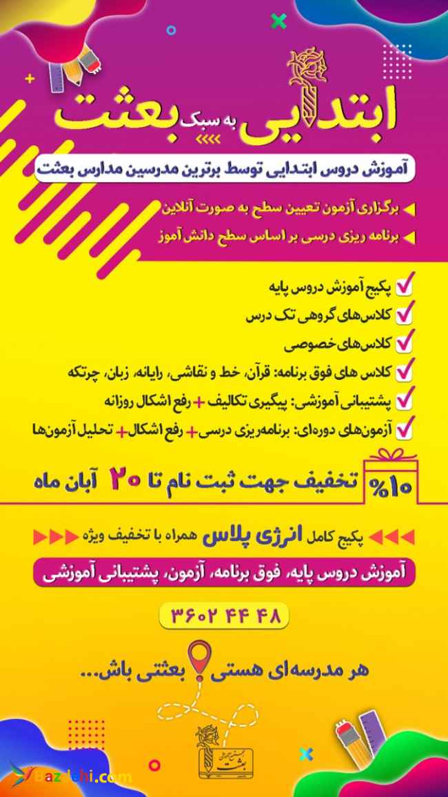 آموزش دروس پایه و فوق برنامه بصورت گروهی و خصوصی در شیفت عصر تدریس توسط برترین معلمین مدارس بعثت انجام تست تعیین سطح و برنامه ریزی درسی اختصاصی برای هر دانش آموز پشتیبانی آموزشی روزانه و پیگیری تکالیف آزمون های دوره ای به همراه تحلیل، رفع اشکال و برنامه ریزی امکان ثبت نام در کلاس های تک درس و خصوصی امکان ثبت نام در پکیج کامل "انرژی پلاس" با تخفیف ویژه