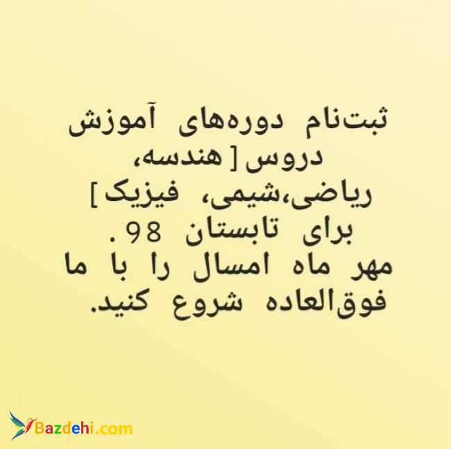 امروزه دانشآموزان برتر، به روزترین منابع تخصصی دروس پایه هستند. ما دو دانشآموز از مدرسه سادات(برترین دبیرستان از نظر قبولی دانشگاه های برتر) و ادب(پر سابقه ترین دبیرستان استان)، تصمیم به آموزش مطالب تخصصی دهم از سطح پایه تا سطح المپیاد، با کمترین قیمت ممکن گرفته ایم. جلسه معارفه و جلسه رسمی اول، رایگان است و جلسات بعدی هم با قیمت توافقی از جلسه ای 29000تومان تا بیشتر نسبت به سطح درخواستی و توافق متغیر است.