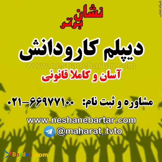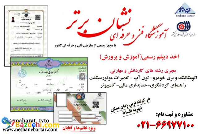 آموزشگاه فنی و حرفه ای نشان برتر با مجوز رسمی از سازمان فنی و حرفه ای کشور مجری رشته های کاردانش و مهارتی اخذ مدرک سیکل و دیپلم رسمی (ویژه آقایان و خانم ها) چنانچه تاکنون موفق به اخذ دیپلم نشده اید یا دارای مدرک سیکل یا پایین تر از آن می باشد شما میتوانید با ثبت نام در هر یک از رشته های : اتومکانیک ، برق خودرو ،راهنمای گردشگری،برنامه نویسی پایگاه داده ، تصویرسازی دیجیتالی ، حسابداری مالی در آموزشگاه نشان برتر و با معرفی به طور همزمان در یکی از مراکز آموزش و پرورش به صورت غیر حضوری ، جهت اخذ دروس عمومی ثبت نام به عمل آورده و در سریع ترین زمان ممکن دیپلم خود را از آموزش و پرورش دریافت نمایید و ادامه تحصیل دهند. مزایای ثبت نام در آموزشگاه نشان برتر: اخذ گواهینامه بین المللی شهریه به صورت نقد – اقساط درصد قبولی بالا و در سریع ترین زمان ممکن کلاس به صورت حضوری و غیر حضوری برگزار می گردد محل برگزاری : چهار راه ولیعصر، پایین تر از تئاتر شهر ، به سمت جمهوری ، خیابان هاشمی ف پلاک 39 مشاوره و ثبت نام: 02166977100 آدرس : چهار راه ولیعصر، پایین تر از تئاتر شهر ، به سمت جمهوری ، خیابان هاشمی فر پلاک 39 تلفن ثابت : 02166977100 شماره همراه : 09124709044 ایمیل : این آدرس ایمیل توسط spambots حفاظت می شود. برای دیدن شما نیاز به جاوا اسکریپت دارید آدرس سایت : http://www.neshanebartar.com/Default.aspx کانال تلگرام : https://t.me/maharat_tvto کانال اینستاگرام: https://www.instagram.com/neshanebartar/ ********** اخذ دیپلم رسمی دیپلم آسان دیپلم فوری دیپلم برنامه نویسی دیپلم حسابداری دیپلم گردشگری دیپلم مکانیک خودرو دیپلم مکانیک و برق خودرو دیپلم اتومکانیک دیپلم کارودانش دیپلم غیر حضوری دیپلم آموزش از راه دور سیکل اخذ مدرم سیکل مدرک سیکل دیپلم آموزش و پرورش دیپلم بزرگسالان دیپلم فنی و حرفه ای دیپلم دیپلم محدوده ولیعصر دیپلم محدوده انقلاب دیپلم محدوده جمهوری دیپلم راهنمای گردشگری دیپلم فنی و حرفه ای دیپلم غیر حضوری اخذ مدرک سیکل دیپلم با استعلام دیپلم قانونی دیپلم تصویرسازی دیجیتالی دیپلم گرافیک دیپلم فناوری اطلاعات دیپلم حسابداری مالی و بازرگانی