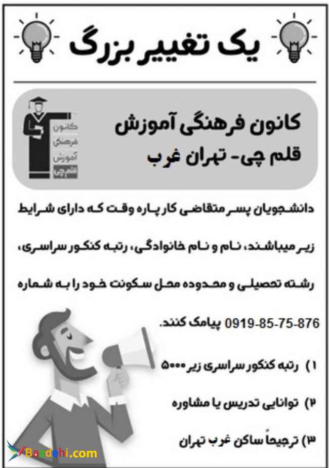 کانون فرهنگی و آموزش قلم چی برای تکمیل کادر مشاوره و تدریس خود از دانشجویانی که دارای رتبه کنکور سراسری زیر 5000 و ترجیحا ساکن غرب تهران میباشند دعوت به همکاری مینماید. لطفا نام،رتبه کنکور،دانشگاه ،سن و رشته خود را به این شماره ارسال کنید 09198575876