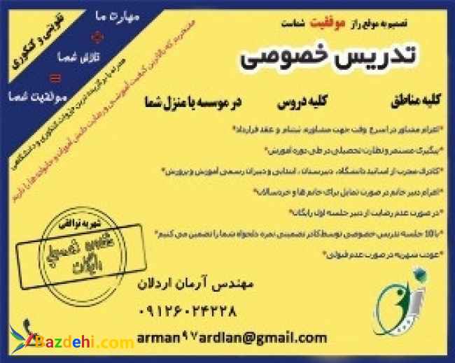 تدریس خصوصی در تمام مقاطع تحصیلی از مقطع ابتدایی تا دبیرستان،کنکور و دانشگاه با قیمت مناسب همراه با جزوات،امکانات و تجهیزات کمک آموزشی رایگان با روش های نوین تدریس شامل کلیه دروس ریاضیات،فیزیک،شیمی، عربی،کامپیوتر، کنکور و دانشگاه ؛ اعزام دبیر در هر نقطه از تهران ؛ ارائه وسایل کمک آموزشی و منابع درسی و کمک درسی رایگان با مدیریت مهندس آرمان اردلان کارشناس ارشد مهندسی کامپیوتر باتجربه و سوابق 20 ساله آموزشی، فنی و تخصصی تلفن های تماس : 09126024228 - 09384741745 ZiziBazli2019@gmail.com Arman97این آدرس ایمیل توسط spambots حفاظت می شود. برای دیدن شما نیاز به جاوا اسکریپت دارید