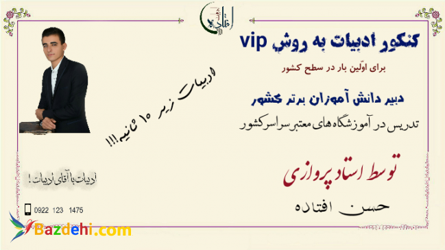 تدریس ادبیات کنکور در قالب کلاس های گروهی و خصوصی تدریس توسط دبیر برجسته و افتخارآفرین شمالغرب کشور تدریس ادبیات به روش vip برای اوّلین بار در سطح کشور تضمین ادبیات بالای 90 تدریس در همه رشته ها به صورت تخصّصی ادبیات را با آقای ادبیات کشور تجربه کنید جهت رزرو و شرکت در کلاس های استاد ، با مدیربرنامه استاد تماس حاصل فرمائید.