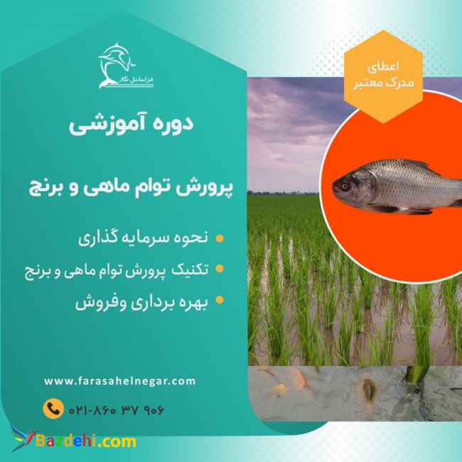 دوره آموزشی پرورش ماهی و برنج در شالیزارها با مدرک مزایای پرورش ماهی در شالیزار: کاهش مصرف سموم و دارو در شالیزارها کاهش مصرف کودهای شیمیایی در شالیزارها مبارزه با کرم ساقه خوار برنج افزایش درآمد خانوارهای روستایی دوره آموزشی پرورش ماهی و برنج در شالیزارها با مدرک معتبر فراساحل نگار به مدت 4 روز متوالی آموزش صفر تا صد تولید برخی از سرفصل این دوره: انتخاب مکان مناسب و نحوه احداث مزرعه کشت توام برنج و کپور ماهیان تشخیص انواع کپور ماهیان انجام کاشت برنج و رعایت اصول صحیح رهاسازی بچه ماهی مراحل کاشت ، داشت ، برداشت برنج مدیریت مزرعه در حین دوره پرورش تغذیه بچه ماهیان در طول دوره پرورش رعایت نکات بهداشتی و پیشگیری از بیماریها در طول دوره پرورش صید کپور ماهیان و عرضه آنها برآورد اقتصادی مزرعه پرسش و پاسخ گواهینامه معتبر جهت اخذ مجوز و تسهیلات بانکی