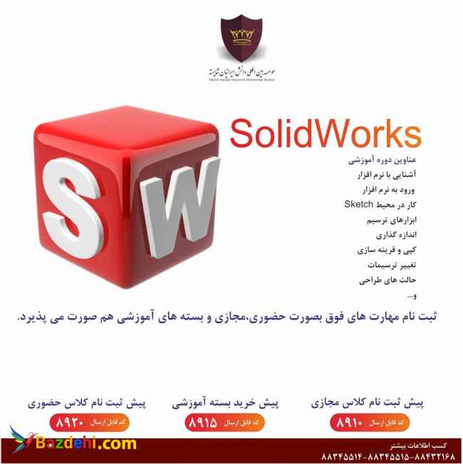 آموزش نرم افزار نقشه کشی صنعتی solidworks به صورت مقدماتی و به صورت بسته های اموزشی می باشد در این بسته سه حالت طراحی سالیدورکز همراه مثال آموزش داده شده است با این بسته می توانید با محیط های سالیدورکز آشنا شوید و این نرم افزار را فرا بگیرید جهت دریافت بسته با شماره های ذیل تماس حاصل نمایید 88345514 88345515 موسسه بین المللی دانش ایرانیان شایسته نقشه کشی- مونتاژ- سه نماگیری- تلرانس گذاری- نقشه کشی