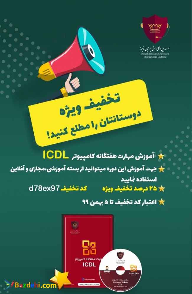 آموزش ICDL آموزش به صورت آنلاین، آفلاین و بسته آموزشی می باشد. همراه با تخفیف 25 درصدی، از این فرصت استفاده کنید! این مهارت را با کمترین قیمت آموزش ببینید. جهت ثبت نام با شماره های ذیل تماس حاصل نمایید: موسسه بین المللی دانش ایرانیان شایسته 88345514 88345515 ICDL -Word -Powerpoint -Excel -Access- - مهارت هفتگانه کامپیوتر- کار با رایانه- مدرک ICDL- مدرک مهارت هفتگانه کامپیوتر- Windows-Internet- windows7 - windows10