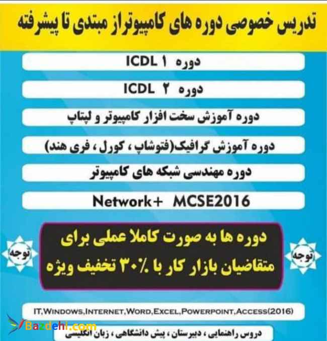 تدریس کلیه دروس کامپیوتر از پایه تا پیشرفته در منزل یا محل کار شما (تمام سنین) تدریس تایپ سریع به صورت رایگان روی تمام دوره ها میباشد ۱) دروس مهارت های هفت گانه ICDL 1,2 مبانی و ویندوز و اینترنت Word,Excel, PowerPoint ۲) دروس شبکه های کامپیوتری Network + , MCSE , ... اکتیو دایرکتوری و مجازی سازی ۳) گرافیک(فتوشاپ و کورل و فری هندو...) ۴) تعمیرات و اسمبل کیس و سخت افزار ۵) برنامه نویسی و دروس کامپیوتر دبیرستان و هنرستان و دانشگاه با 12 سال سابقه تدریس و دارای مدرک بین المللی از مایکروسافت میباشم. به صورت تخصصی و با بهترین متد برای تمام سنین به صورت روان و همراه با جزوه و... بدون محدودیت تایمی در زمان برگزاری کلاس از ساعت 8 الی 24 در سریعترین زمان در منزل و محل کار شما 09191281077 روش های تدریس: تدریس به زبان ساده با انتقال مطلب بالا مهمترین نکته در تدریس بنده تعیین سطح و انتقال مطالب کاربردی و عملی است که تکنیک و تخصص بنده میباشد. در ضمن در محیط های عملی و تجربه کاری بالا در تدریس بسیار مهم است .
