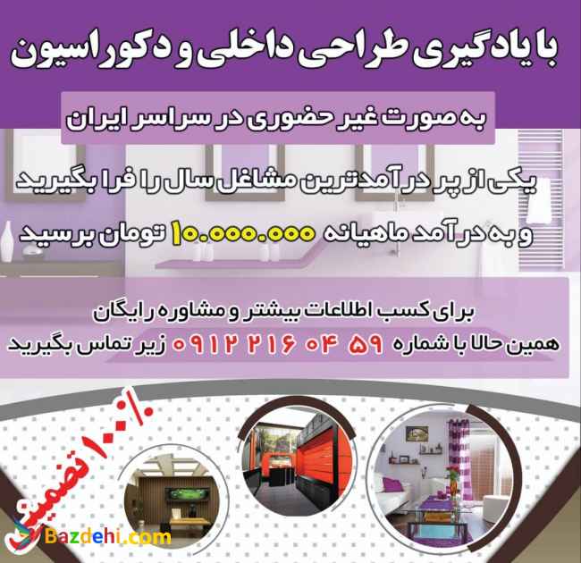 ما در جامعه ای زندگی میکنیم که جمعیتمان به مرور در حال افزایش است و بخاطر فضای کم خانه ها یا مسائل مربوط به اهمیت زیباسازی، مردم تمایلی بیشتری به طراحی دکوراسیون داخلی پیدا کرده اند. شما با چند ماه آموزش آنلاین با بهترین نرم افزارهای کاربردی طراحی در انتهای دوره میتوانید به صورت کامل طراحی کامل آشپزخانه، چیدمان مبلمان، طراحی اتاق خواب ، طراحی کمدها و تخت های کم جا، طراحی مغازه و فروشگاه ها و ... را انجام دهید و به درآمد فوق العاده و دور از حد تصور خود برسید. فقط کافیست با شماره همراه 09122160459 تماس بگیرید و آینده ی شغلی خود را تضمین کنید. شعار ما آموزش کاربردی و سریع و آسان و تضمینی است