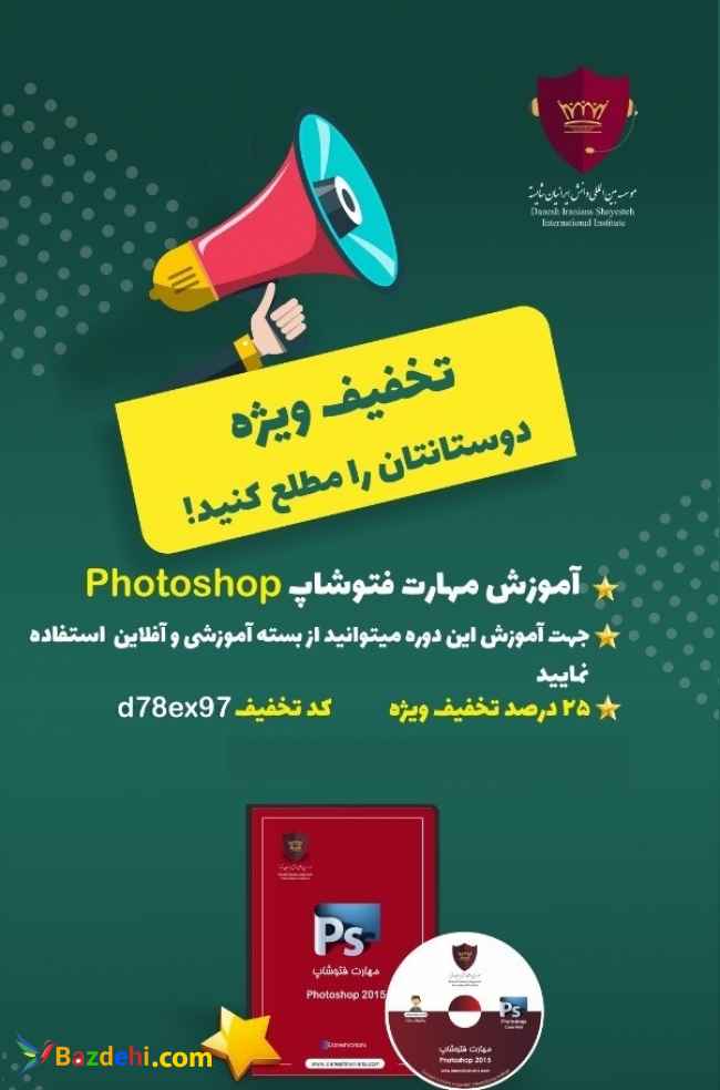 Photoshop نرم افزاری گرافیکی است که توسط آن می توانید به عکسها افکت داده و یا عکس ها را تعمیر و ویرایش نمایید در این بسته همراه مثال میتوانید گزینه های مختلف نرم افزار را آموزش ببینید و آنهارا به کاربگیرید مانند روتوش عکس-ویرایش عکس-تغییرنماهای عکس و ... هزینه آموزش همراه با تخفیف می باشد از این تخفیفات استفاده نمایید و آموزش ببینید تا 10 بهمن میتوانید از کد تخفیف استفاده نمایید جهت استفاده از تخفیف به سایت موسسه دانش ایرانیان شایسته مراجعه کنید می توانید آموزشها را به صورت زیر دریافت نمایید. 1- بسته آموزشی 2- آنلاین 3- آفلاین جهت دریافت بسته اموزشی با شمارههای ذیل تماس حاصل نمایید 88345514 88345515 Photoshop-فتوشاپ-ویرایش عکس-روتوش-افکت موسسه بین المللی دانش ایرانیان شایسته