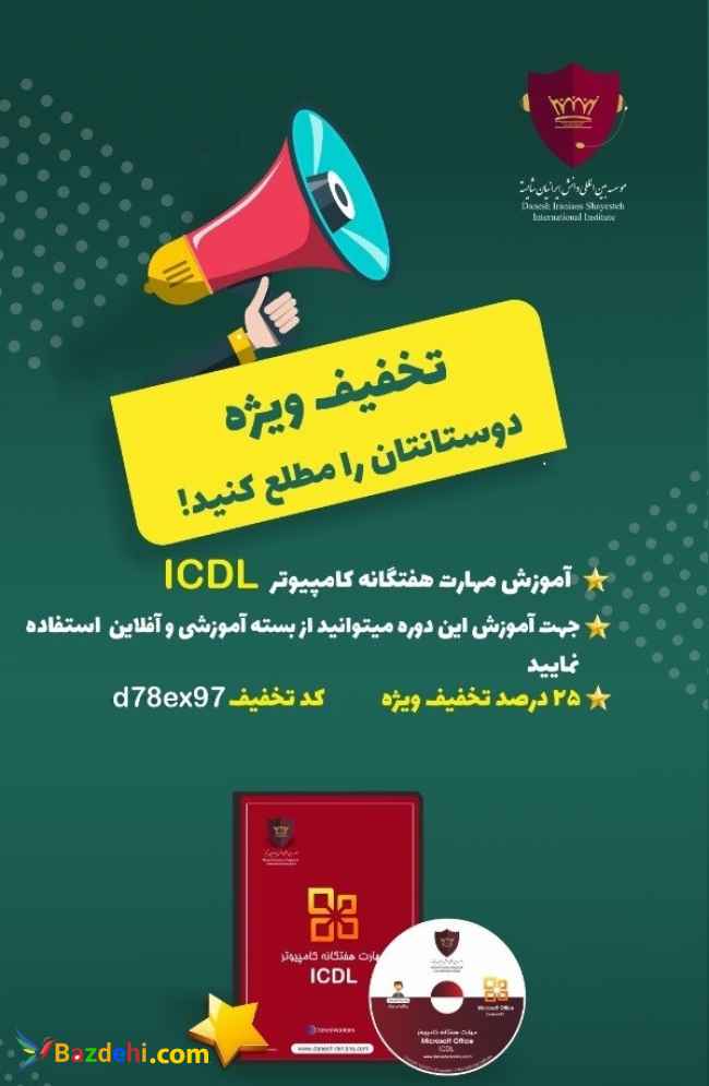 تخفیف در آموزش ICDL یک استاندارد بین المللی در مهارت های کاربردی کامپیوتر است. این برنامه یک گواهینامه با کیفیت بالا و معتبر در سطح بین المللی است که توسط متخصصان دانشگاهی و بین المللی از سراسر جهان طراحی، ارزیابی و تأیید شده است. (Windows) آشنائی با شیوه استفاده از کامپیوتر ومدیریت فایلها (Word) شیوه به کارگیری نرم افزار واژه پرداز (Excel) شیوه کار با صفحه گسترده (Access) شیوه استفاده از نرم افزار پایگاه داده ها (Powerpoint) شیوه کار با نرم افزار ارائه مطلب (Internet) اطلاعات و ارتباطات هزینه آموزش همراه با تخفیف می باشد از این تخفیفات استفاده نمایید و آموزش ببینید تا 10 بهمن میتوانید از کد تخفیف استفاده نمایید جهت استفاده از تخفیف به سایت موسسه دانش ایرانیان شایسته مراجعه کنید می توانید آموزشها را به صورت زیر دریافت نمایید. 1- بسته آموزشی 2- آنلاین 3- آفلاین جهت دریافت بسته آموزشی با شماره های ذیل تماس حاصل نمایید. موسسه بین المللی دانش ایرانیان شایسته 88345514 88345515