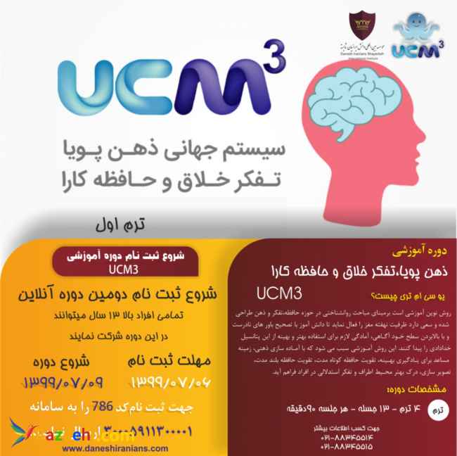 UCM3 روش نوین آموزشی است بر مبنای مباحث روانشناختی در حوزه حافظه، تفکر و ذهن طراحی شده و سعی دارد ظرفیت نهفته مغز را فعل نماید تا دانش آمز با تحیح باورهای نادرست و بالا بردن سطح خود آگاهی، آمادگی لازم برای استفاده بهتر و بهینه از این پتانسیل خدا دادی را پیدا کند. این روش آموزشی سبب می شود که با آماده سازی ذهنی، زمینه مساعد برای یادگیری بهینه، تقویت حافظه کوتاه مدت، تقویت حافظه بلند مدت تصویر سازی، درک بهتر محیط اطراف و تفکر استدلالی در افراد فراهم آید. مشخصات دوره: 4 ترم- 13 جلسه- هر جلسه 90 دقیقه- جهت کسب اطلاعات بیشتر : 02188345514 02188345515 موسسه بین المللی دانش ایرانیان شایسته