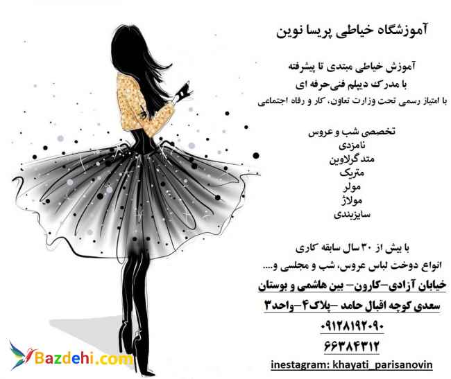 آموزشگاه خیاطی پریسا نوین آموزش خیاطی مبتدی تا پیشرفته با مدرک دیپلم فنی¬حرفه ای با امتیاز رسمی تحت وزارت تعاون، کار و رفاه اجتماعی تخصصی شب و عروس نامزدی متد گرلاوین متریک مولر مولاژ سایزبندی با بیش از 30 سال سابقه کاری انواع دوخت لباس عروس، شب و مجلسی و.... خیابان آزادی-کارون- بین هاشمی و بوستان سعدی کوچه اقبال حامد -پلاک4-واحد3 09128192090 66384312 Inestagram: khayati_parisanovin
