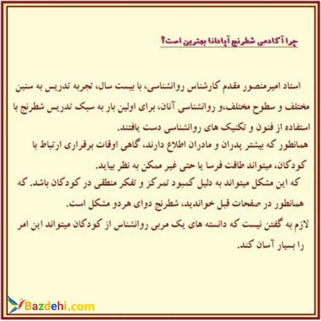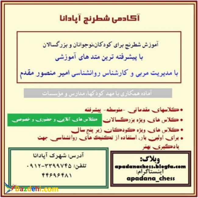 تدریس شطرنج آنلاین،خصوصی،حضوری و عمومی تلفن همراه: 09123399745 تلفن ثابت: 02144696481 آدرس سایت: http://apadanachess.blogfa.com/ ادرس اینستاگرام:https://instagram.com/apadana_chess?igshid=YmMyMTA2M2Y= آدرس: شهرک آپادانا بلوک 11 ورودی 4 مربی درجه 1و با سابقه شطرنج. با تمامی رده های سنی و روش های منحصر به فرد تدریس. کلاس های آنلاین و خصوصی و حضوری و عمومی در شهرک آپادانا. اموزش شطرنج با تصویر انواع شطرنج آموزش ابتدایی شطرنج آموزش آنلاین شطرنج حرفه ای آموزش حرکت مهره های شطرنج آموزش رایگان شطرنج حرفه ای آموزش شطرنج از مبتدی تا پیشرفته آموزش شطرنج قسمت اول بهترين مدرسه شطرنج تهران تدريس خصوصي شطرنج تدریس خصوصی شطرنج برای کودکان تمرین شطرنج آنلاین خرید شطرنج دانلود آموزش شطرنج حرفه ای دانلود بازی شطرنج دانلود بازی شطرنج برای موبایل سایت آموزش شطرنج رایگان شطرنج آنلاین شطرنج چیست شطرنج حرفه ای فیلم آموزش شطرنج فیلم شطرنج کتاب آموزش شطرنج کلاس آنلاین شطرنج کلاس آنلاین شطرنج کودکان تهران کلاس شطرنج حضوری متوسطه پیشرفته حرفه ای · آموزش رایگان آنلاین شطرنج معمای شطرنج آنلاین هزینه کلاس شطرنج
