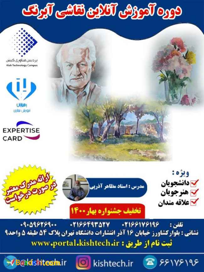 دوره آموزش آنلاین نقاشی آبرنگ از تکنیک های فوق العاده جذاب نقاشی می باشد که بدلیل ویژگی های منحصر به فرد ، لوازم تکنیک ها و شیوه های اجرای بسیار متنوع و جالبی دارد. نقاشی آبرنگ زیبا و پر فریب است که هنرمند با پا گذاشتن به آن می تواند از هر لحظه آن تجربه و لذتی بی نظیر ببرد. هرگوشه آن رمزو رازی دارد که هنرمند را به خود میخواند. تکنیک های اجرای آبرنگ میتوان به روش خیس در خیس قلم موی خشک روش پاک کردن با دستمال کاغذی روش پاشیدن رنگ با قلم مو اجرا با اسفنج اجرا با چسب میسکیت یا ماسک مایع اشاره کرد. که هرکدام به نوبه خود میتوانند در رشد و پیشرفت هنرمند نقش بسزایی ایفا کنند.از آنجایی که طراحی و نقاشی مهارت است و هنرمند فقط میتواند از طریق تمرین و تکرار به سطح مهارت برسد ،همچنین نقاشی آبرنگ میتواند علاوه بر لذت تجربه وصف ناپذیری که دارد، راه مناسبی در جهت تقویت چشم و دید و قدرت اجرای دست هنرمند باشد. ارتباط با ما : تلفن : ۰۲۱۶۶۱۷۶۱۹۶ ۰۲۱۶۶۴۹۳۵۲۷ ۰۹۰۵۹۶۲۶۹۰۰ نشانی : بلوارکشاورز خیابان ۱۶ آذر انتشارات دانشگاه تهران پلاک ۵۴ طبقه۵ واحد ۹ ثبت نام از طریق سایت زیر www.portal.kishtech.ir