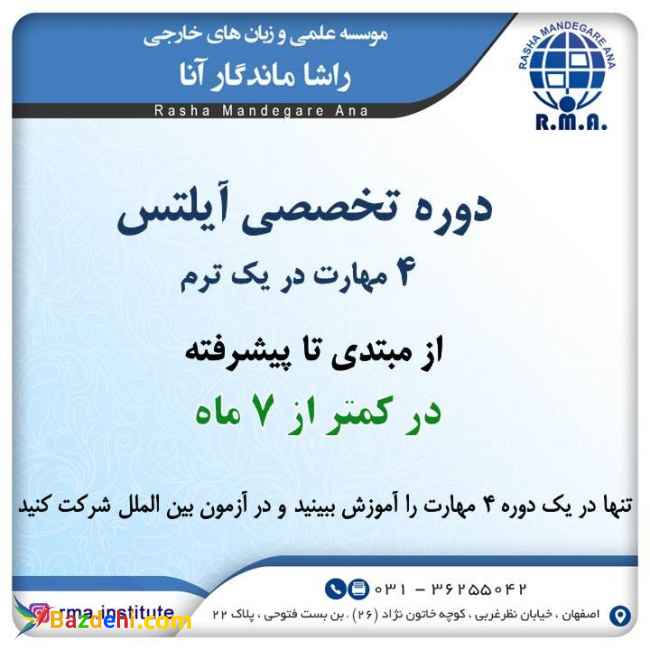 آموزش تخصصی آیلتس در کمتر از 7 ماه آموزش آیلتس در کمتر از 7 را در موسسه راشا ماندگار آنا فرا بگیرید و بعد از آن در آزمون بین المللی شرکت کنید. آموزش آیلتس توسط دبیر با سابقه در موسسه انجام می شود. برای مشاوره با شماره تلفن 36255042 در اصفهان تماس حاصل فرمایید و وقت مشاوره دریافت کنید. برای دریافت اطلاعات دوره و شهریه می توانید حضوری نیز تشریف بیارید. آدرس موسسه: اصفهان- خیابان نظر غربی- کوچه خاتون نژاد- بن بست فتوحی - پلاک 22 شماره واتس آپ موسسه: 09137895605