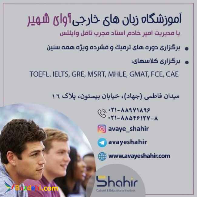 موسسه ی آوای شهیر در زمینه آموزش زبان انگلیسی فعالیت دارد و برگزار کننده ی دوره های آمادگی آزمون های تافل، آیلتس، جی آر ای، جی مت، تافل دکتری و همچنین کلاس های ترمیک مکالمه برای کودکان، نوجوانان و بزرگسالان می باشد. تلفن همراه :09122341201 تلفن ثابت :02188971896 ایمیل این آدرس ایمیل توسط spambots حفاظت می شود. برای دیدن شما نیاز به جاوا اسکریپت دارید آدرس سایت: http://www.avayeshahir.com اینستاگرام: avaye_shahir https://instagram.com/avaye_shahir?igshid=YmMyMTA2M2Y= نام و نام خانوادگی امیر خادم نام واحد تجاری آوای شهیر استان تهران امکانات کارت خوان, مشاوره رایگان, فروش اینترنتی, فضای باز, مناسب برای کودکان آدرس : تهران. میدان فاطمی (جهاد)، خیابان بیستون، پلاک 16، واحد 1