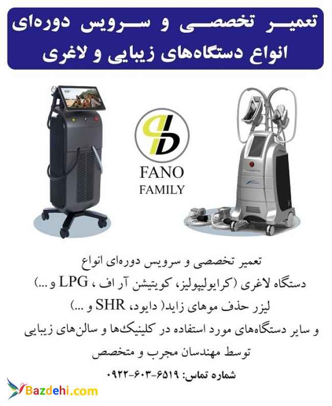 تعمیرات تخصصی و سرویس دوره‌ای انواع دستگاه‌های زیبایی و لاغری نگران نباشید، ما درستش می‌کنیم... تعمیر تخصصی و سرویس دوره‌ای انواع لیزر حف موهای زاید( تیتانیوم، پلاتینیوم، دایود، SHR و ...) دستگاه لاغری( کرایولیپولیز، کویتیشن آر اف، LPG و ...) تعمیر انواع دستگاه جوانساز و زیبایی( هایفو، کربوکسی، آر اف سرجری، پلاسماجت و ...) و سایر دستگاه‌ها و تجهیزات مورد استفاده در کلینیک‌ها و سالن‌های زیبایی توسط مهندسین متخصص. تعمیر و نگهداری از تجهیزات کلینیک و سالن زیبایی خود را به متخصصان با تجربه بسپارید. جهت مشاوره با ما تماس بگیرید: 6519-603-0922