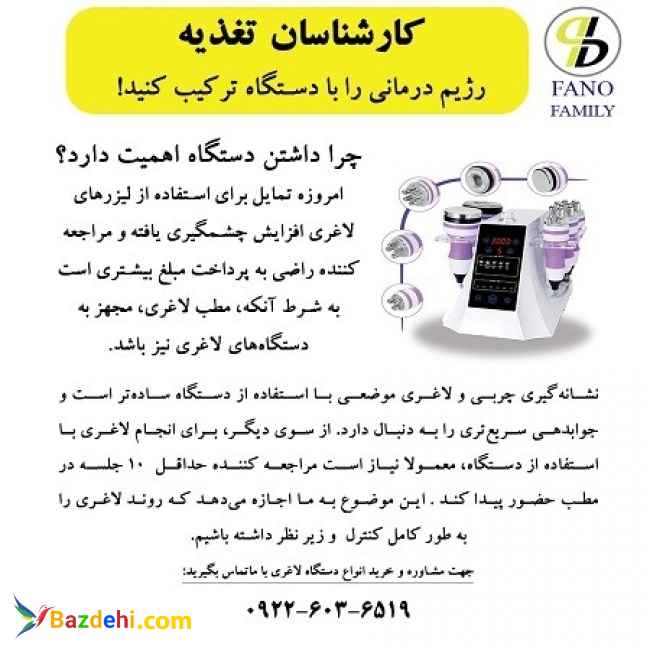 کارشناسان تغذیه، رژیم درمانی را با دستگاه ترکیب کنید! امروزه تمایل برای استفاده از لیزرهای لاغری افزایش چشمگیری یافته است. مراجعه کننده برای انجام لاغری، راضی به پرداخت مبلغ بیشتری است به شرط آنکه، مطب لاغری، مجهز به دستگاههای لاغری نیز باشد. به عنوان مثال برای دریافت رژیم لاغری راضی به پرداخت بیش از 300 هزار تومان نمیشوند ولی برای انجام لاغری با استفاده از دستگاه و رژیم غذایی، حاضر به پرداخت بیش از 3 میلیون تومان هستند. از سوی دیگر نشانهگیری چربی و انجام لاغری به صورت موضعی با استفاده از دستگاه بسیار ساده و جوابدهی حاصل از آن سریعتر و ملموستر است و سبب رضایت مراجعه کننده نیز میشود. همچنین جهت انجام لاغری با استفاده از دستگاه معمولا نیاز است مراجعه کننده حداقل 10 جلسه به کلینیک مراجعه کند و این موضوع به ما اجازه میدهد روند لاغری را بطور کامل کنترل و زیر نظر داشته باشیم. از دیگر مزایای استفاده از دستگاه لاغری به همراه رژیم درمانی، نیاز به حضور مکرر مراجعه کننده به کلینیک زیبایی شما است. در بحث بازاریابی این موضوع سبب شلوغی مطب میشود. ایجاد صف و شلوغ بودن مطب امری بسیار مهم و خوشایند است. دستگاه لاغری کویتیشن آر اف فانو دستگاهی زیبا با هزینه ای معادل یک دهم سایر دستگاه های لاغری، شما را در جلب و رضایت مشتری کمک میکند. با خرید این دستگاه کاربردی در فروش ویژه شرکت تجهیزات زیبایی فانو، یک ترالی زیبا را به رایگان هدیه بگیرد. قیمت دستگاه آر.اف کویتیشن فانو، 25 میلیون تومان است (به راحتی پس از چند ماه با استفاده از کارکرد دستگاه معادل هزینه خرید دستگاه درآمد خواهید داشت). این دستگاه دارای یکسال گارانتی و ده سال خدمات پس از فروش است. جهت مشاوره و خرید انواع دستگاه لاغری( کویتیشن آر اف، کرایولیپولیز و ...) با ما تماس بگیرید: 0922-603-6519
