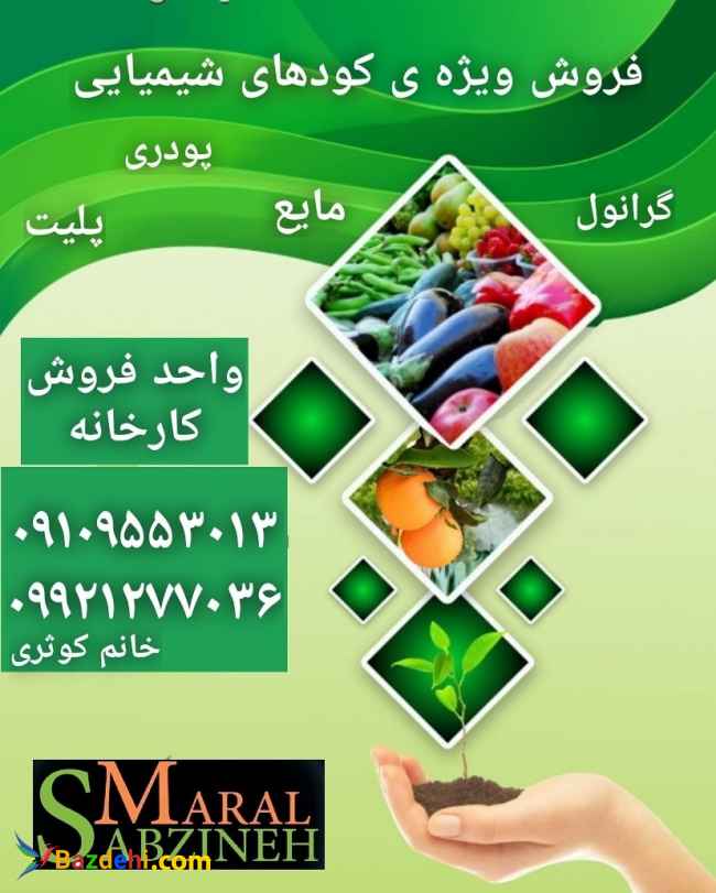 ☘☘☘ کودهای شیمیایی سبزینه مارال ???تولید انواع کود ✅انواعNPK ✅ریز مغذی ها(micromax) ✅هیومیک مایع،گرانول،پودری ✅گوگرد معدنی پودری ،گرانول ✅مایع مرغی ✅پلیت مرغی ✅سولوپتاس ✅سولفات آهن ✅روت نید ✅گرونید ✅جلبک دریایی ✅انواع کود کامل گرانوله ✅پتاسیم مایع ✅فسفر و پتاس پودری ?خریدی مطمئن و به صرفه برای فعالان عرصه ی کشاورزی ?ارسال به سراسر کشور ?واحد فروش کارخانه?? ?۰۹۱۰۹۵۵۳۰۱۳ و ۰۹۹۲۱۲۷۷۰۳۶ خانم کوثری