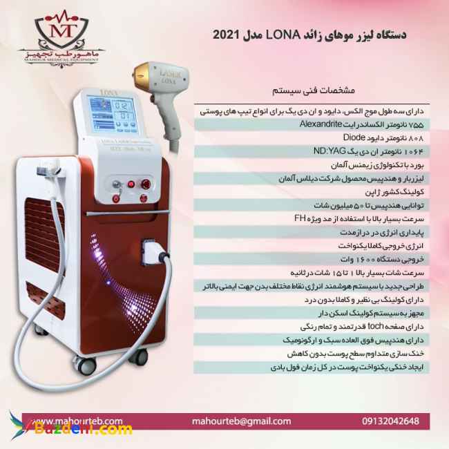*** مشاوره و تجهیز فقط به صورت حضوری در محل شرکت ماهور طب انجام می شود. *** دستگاه لیزر الکساندرایت ترکیبی لونا دارای سه طول موج الکساندرایت 755 نانومتر، دایود 808 نانومتر و اندیاگ 1064 نانومتر است که ترکیب این سه طول موج باهم منجر به جوابدهی بسیار عالی برای لیزر موهای زائد در انواع تیپ های پوستی می شود. تعداد دستگاه های الکس ترکیبی در دنیا بسیار کم است و اگر بخواهید دستگاه الکساندرایت سه طول موج واقعی و مطابق استانداردهای جهانی پیدا کنید باید حتما از معتبر بودن شرکتی که این نوع دستگاه را ارائه می دهد مطمئن شوید و سپس این دستگاه را خریداری کنید. شرکت ماهور طب با بیش از 13 سال سابقه فعالیت در حوزه تولید و واردات دستگاه های زیبایی، لیزر و لاغری دستگاه لیزر الکساندرایت سه طول موج لونا را مطابق با استانداردهای جهانی و با کیفیت بسیار بالایی تولید و روانه بازار ایران کرده است. برای اطمینان خاطر از کیفیت این دستگاه و اطمینان از استاندارد بودن آن می توانید با کارشناسان ماهور طب تماس حاصل کنید. برخی از مزایای لیزر الکساندرایت سه طول موج لونا • قطعات به کار برده شده در دستگاه لیزر الکس ترکیبی لونا تولید کمپانی معتبر اروپایی است و استانداردهای لازم را دارد و جوابدهی بهتر، عملکرد فوق العاده بالاتر و سرعت بیشتری نسبت به سایر دستگاه های لیزر دارد. • برای تمامی افراد با انواع تیپ های پوستی از 1 تا 6 می توان از آن استفاده کرد. • دارای چیلر داخلی قدرتمند با خنک کنندگی فوق العاده عالیست و دمای سر هندپیس در تمام مراحل درمان خنک باقی می ماند. • سرعت شات دستگاه لونا 1 الی 15 شات در ثانیه است که نسبت به سایر دستگاه های لیزر بالاترین سرعت را دارد و به همین علت سرعت درمان با دستگاه الکس سه طول موج لونا بسیار بالاست. • در چند جلسه درمانی ابتدایی با دستگاه لیزر الکس سه طول موج لونا نتایج چشمگیری در حذف موهای زائد مشاهده می شود. • عوارض استفاده از دستگاه لیزر الکس بسیار کم است و به همین علت کسانی که به دنبال دستگاه کم خطری هستند بدون شک از این دستگاه لیزر برای حذف موهای زائد خود استفاده می نمایند. خرید دستگاه لیزر الکساندرایت با شرایط اقساط بدون بهره شرکت تجهیزات پزشکی ماهور طب امکان خرید دستگاه لیزر الکساندرایت لونا به صورت اقساط بدون بهره را برای پزشکان محترم فراهم نموده است. برای دریافت اطلاعات بیشتر در این خصوص می توانید با مشاوران ما تماس بگیرید. مشاور ماهور طب : 09132042648 آدرس سایت : www.mahourteb.com *** مشاوره و تجهیز فقط به صورت حضوری در محل شرکت ماهور طب انجام می شود. *** توجه : شرکت ماهور طب هیچ گونه فروش اینترنتی ندارد!!!
