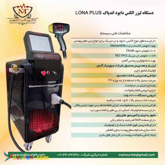 قوی ترین دستگاه لیزر موی زائد سه طول موج با نتیجه تضمینی، کاملا بدون درد با شات نامحدود دستگاه لیزر لونا پلاس جدیدترین و پیشرفته ترین دستگاه لیزر رفع موهای زائد می باشد که با بهره گیری از لیزر بار و هندپیس آلمانی و تابش سه طول موج الکس دایود اندیاگ و همچنین برخورداری از ویژگی های منحصر به فرد مورد توجه بسیاری از کلینیک های زیبایی و پزشکان قرار گرفته است. دستگاه لیزر هرریموال لونا پلاس توانایی زدن شات نامحدود را دارد و مجهز به چیلر و کمپرسور های پاور می باشد. یکی از مهمترین ویژگی های دستگاه لونا پلاس بدون درد بودن لیزر با این دستگاه می باشد. دستگاه لونا پلاس به همراه لیزر بار از کمپانی معتبر جنوپتیک (GENOPTIK) آلمان دارای اثربخشی متفاوت و غیر قابل مقایسه به دلیل استفاده از سه طول موج می باشد. مشخصات دستگاه لیزر سه طول موج لونا پلاس: دستگاه لیزر لونا پلاس اولین و تنها دستگاه دارای چیلر داخلی در ایران با سیستم خنک کننده بسیار قوی برای ثابت نگه داشتن دما » 755 نانومتر الکساندرایت Alexandrite » 808 نانومتر دایود Diode » 1064 نانومتر اِن دی یگ ND:YAG » لیزربار محصول شرکت جنوپتیک آلمان » بورد با تکنولوژی زیمنس آلمان » توانایی هندپیس با شات نامحدود » خروجی دستگاه 2200 وات » مجهز به چیلر و کمپرسور های پاور » دارای کولینگ بی نظیر و کاملا بدون درد » با اثر بخشی متفاوت و غیر قابل مقایسه به دلیل استفاده از سه طول موج ویژگی های خرید از شرکت تجهیزات پزشکی ماهور طب: ∗ وارانتی تضمین کیفیت و جوابدهی دستگاه ∗ آموزش کاملا رایگان همراه با گواهینامه گذراندن دوره آموزشی در محل شما ∗ یکسال گارانتی قطعات، تعویض و تعمیر قطعات بدون کوچکترین هزینه ∗ با ده سال خدمات پس از فروش ∗ ارسال به سراسر کشور ∗ دارای شرایط اقساط بدون بهره برای اطلاع از قیمت و شرایط خرید دستگاه لیزر الکس دایود اندیاگ لونا پلاس با ما تماس بگیرید: مشاور فروش: 09132042648 آدرس سایت: www.mahourteb.com *** مشاوره و تجهیز فقط به صورت حضوری در محل شرکت ماهور طب انجام می شود*** توجه : شرکت ماهور طب هیچ گونه فروش اینترنتی ندارد!!!