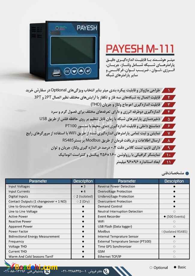میتر هوشمند تابلویی سری PAYESH-M111 یک مرکز اندازه گیری هوشمند است قابلیت اندازه گیری و ارسال انواع پارامتر های الکتریی در شبکه های سه فاز و تکفاز را دارد. میتر هوشمند PAYESH-M111 در یک نگاه : - کنتور(دقت 0.1%): اندازه گیری پارامتر های الکتریکی سه فاز و تکفاز ( ولتاژ و جریان فاز به فاز و فاز به زمین، توان اکتیو و راکتیو و توان ظاهری، فرکانس، توان باز گشتی(Reverse)، توان ژنراتوری(تولید یا مولدی) و توان دو طرفه، دیماند و توان سلفی و خازنی، اندازه گیری دمای داخلی دستگاه، دارای کنتور 4 تعرفه قابل تنظیم - پاور آنالایزر و اندازه گیری کیفیت توان(دقت 0.2%) : محاسبه THD ولتاژ و جریان برای هرفاز جداگانه و سه فاز ، CosՓ، Crest Factor، K Factor، نمایش هارمونیک ها تا هارمونیک 31 (یا 63 به سفارش)بصورت میله ای و درصدی - دیتا لاگر ایونت ریکوردر (Data Logger , Event Recorder) : ذخیره شکل موج تمامی ولتاژ ها و جریانها به قابلیت تنظیم نحوه تریگر شدن، ذخیره بیش از 500 واقعه قابل تنظیم( زمان روشن شدن، عملکرد توابع حفاظتی، کاهش و افزایش ولتاژ یا جریان یا THD و ...) ، ذخیره پروفیل بار و توان و فرکانس و ... در فواصل زمانی 15 ثانیه تا 1 ساعت برای مدت بیش از 1 سال. - قابلیت های حفاظتی: دارای حفاظت های افزایش و کاهش ولتاژ، افزایش و کاهش جریان، افزایش و کاهش THD ، افزایش و کاهش توان اکتیو و راکتیو، حفاظت دیماند، تشخیص پارگی سیم نول، تشخیص برگشت توان(موتوری و ژنوراتوری) ، قابلیت تعریف کنتاکتور خروجی درصورت عملکرد توابع حفاظتی - قابلیت های جانبی : اندازه گیری دمای داخلی،دارای پروتکل مودباس، دارای وای فای، دارای دو ورودی دیجیتال و دوکنتاکت خروجی، تغییر اتوماتیک کنتراست نمایشگر در محدوده وسیع دمایی برای جلوگیری از تار شدن نمایشگر، صفحه نمایشگر با زاویه دید وسیع - قابلیت سفارشی سازی: قابلیت اضافه کردن ماژول 4تا20 میلی آمپر، تغییر تعداد ورودی ها و خروجی ها، اضافه شدن مدار تشخیص اتصال دوفاز و حفاظت از آن، اضافه کردن صفحات اندازه گیری خاص، اضافه کردن توابع حفاظتی و اندازه گیری http://esfagroup.ir/