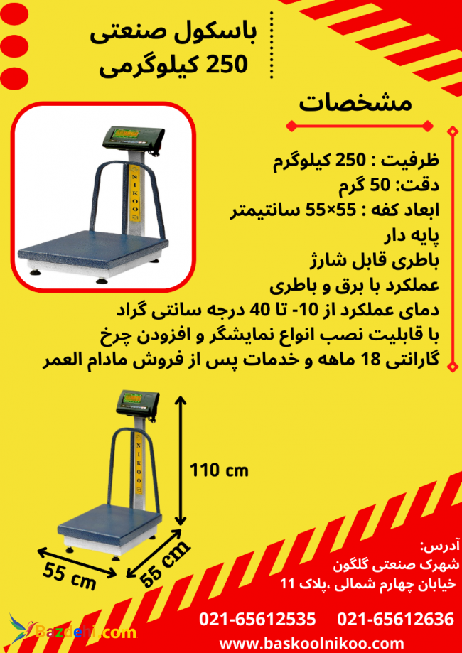 باسکول 250 کیلو گرم الکترونیک نیکو حداکثر وزن 250 کیلو گرم حداقل وزن 5 کیلوگرم دقت 20/50/100 گرم پایه دار باطری قابل شارژ قابلیت نصب نمایشگر پرینتر دار قابلیت نصب نمایشگر بی سیم قابلیت نصب نمایشگر ماشین حساب دار قابلیت نصب چرخ ابعاد صفحه 40×55 برق شهری 220 ولت /60 هرتز دمای عملکرد از _10 تا40 درجه سانتی گراد دارای قابلیت نصب نمایشگر دو طرفه
