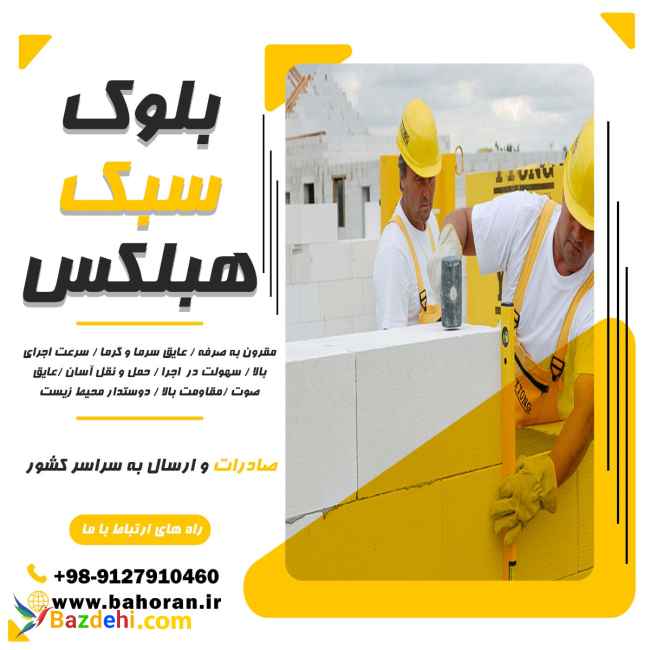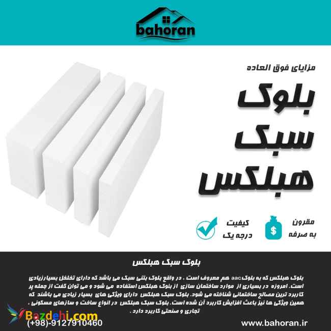 بلوک هبلکس یا بلوک سبک aac، مصالحی از جنس بتن می باشد که کاربرد اصلی آنها در عایق کاری می باشد . از این بلوک ها معمولا در بیرون و داخل ساختمان ها استفاده می شود و با توجه به ساختاری که دارد ، می تواند به آسانی و با سرعت نصب و استفاده شود . با استفاده از بلوک های هبلکس، دیگر نیازی به عایق کاری مجدد نیست چرا که بلوک هبلکس عایق سرما و گرما ، عایق حرارت و رطوبت و…می باشد. احتراماٌجهت کسب اطلاعات بیشتر با کارشناسان ما تماس حاصل نمائید . شماره تماس :۰۹۱۲۷۹۱۰۴۶۰ وب سایت : bahoran.ir اینستاگرام:blockheblex